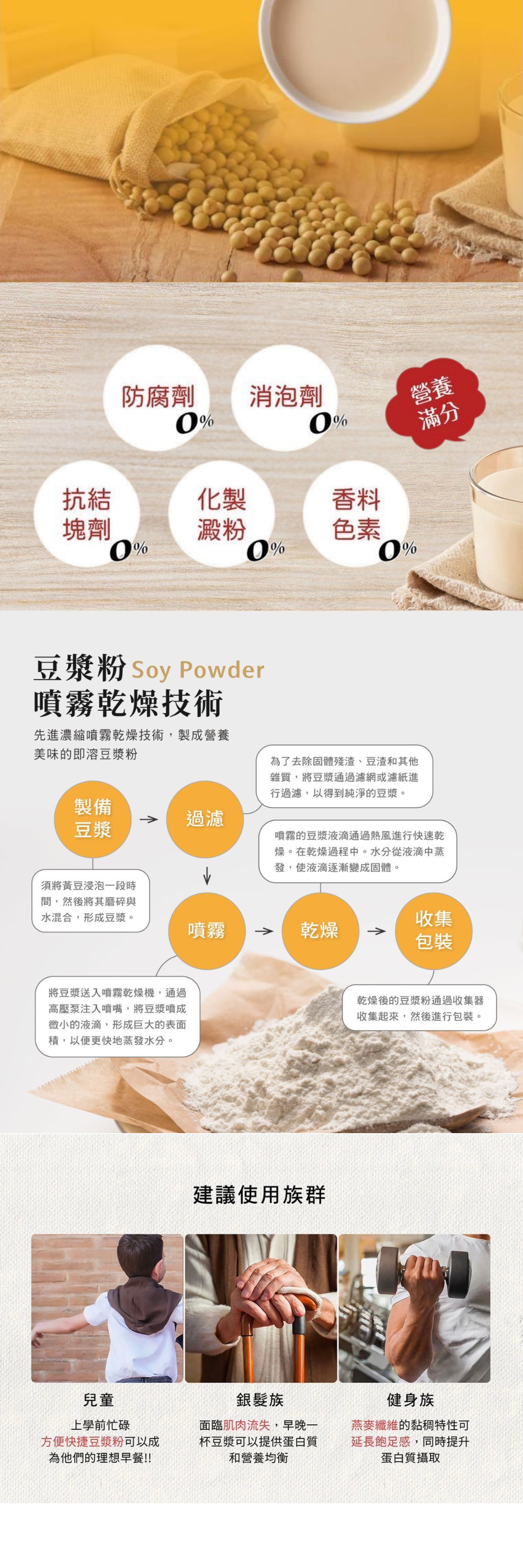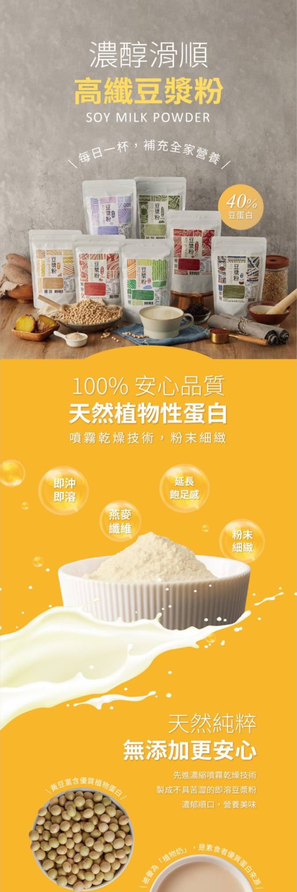 嚴選 非基改黃豆,完整研磨保留高纖營養,搭配噴霧乾燥技術,農醇滑順不結塊。